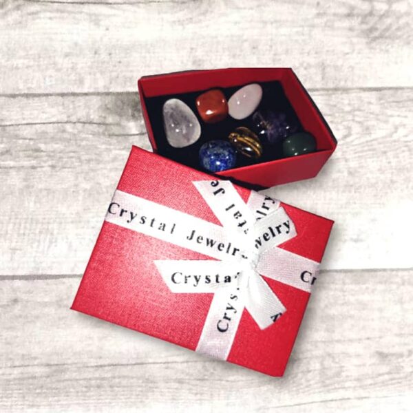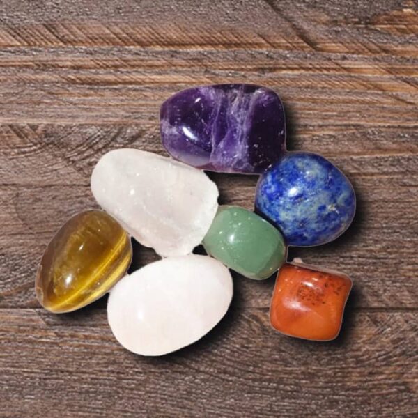 Kit de 7 cuarzos pulidos, cuarzo rosa, lapilazuli, cristal, jade verde, ojo de tiguere, amatista y jaspe rojo.