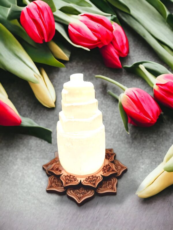 La palabra Selenita viene del término reflexión, este cuarzo es utlizado para atraer paz, serenidad, meditación y relfexión. Esta lámpara es ideal para atraer calma en el lugar donde sea colocada, combinada con las ténues luces de led atrae relajación y paz a su entorno.