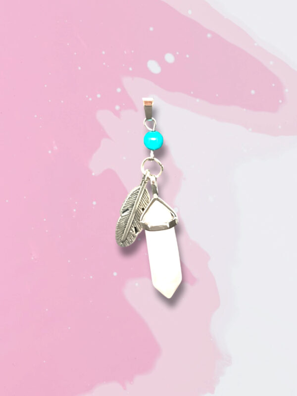 La Turquecita blanca atrae felicidad y paz, conbinado con la pluma de metal ayuda a la proteción espiritual.